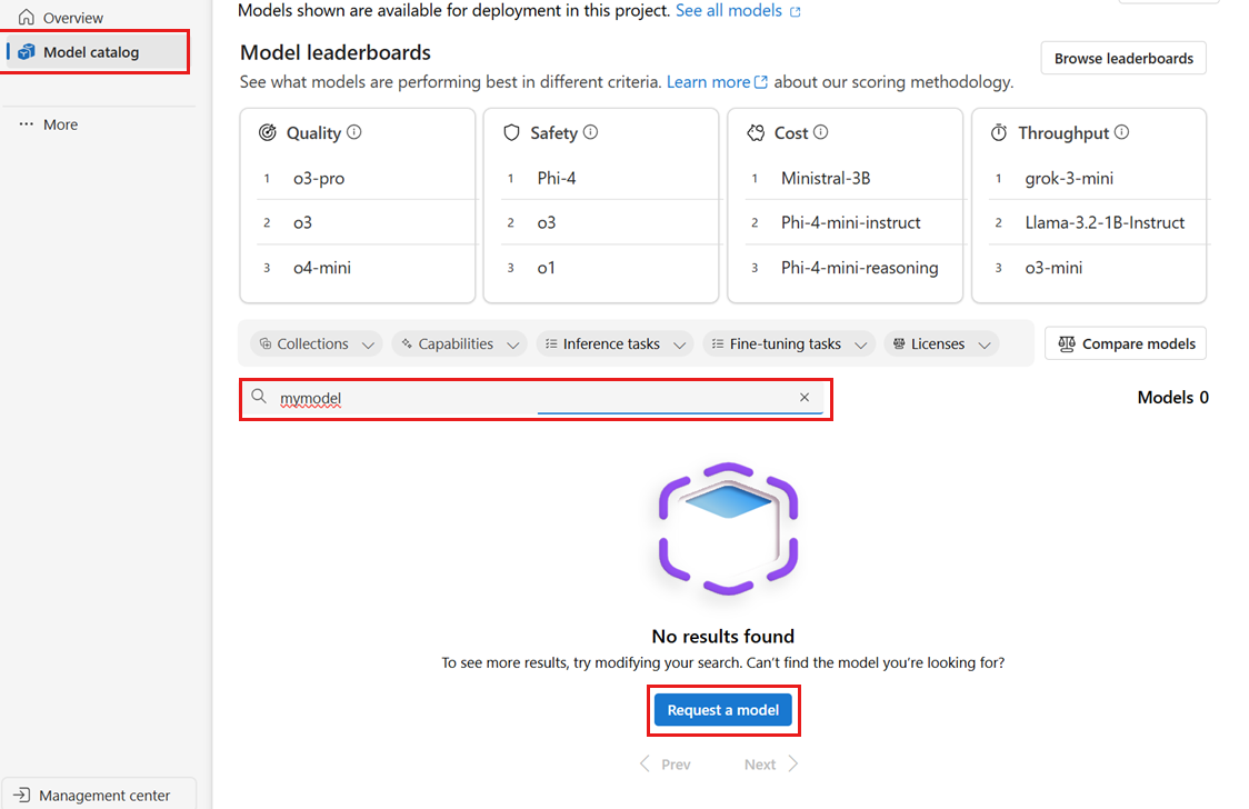 Puede solicitar que agreguemos un modelo al catálogo de modelos, directamente desde la página del catálogo de modelos en el portal de Foundry. En la barra de búsqueda de la página del catálogo de modelos, una búsqueda de un modelo que no existe en el catálogo, como mymodel, devuelve el botón Solicitar un modelo . Seleccione este botón para abrir un formulario en el que puede compartir detalles sobre el modelo que solicita.