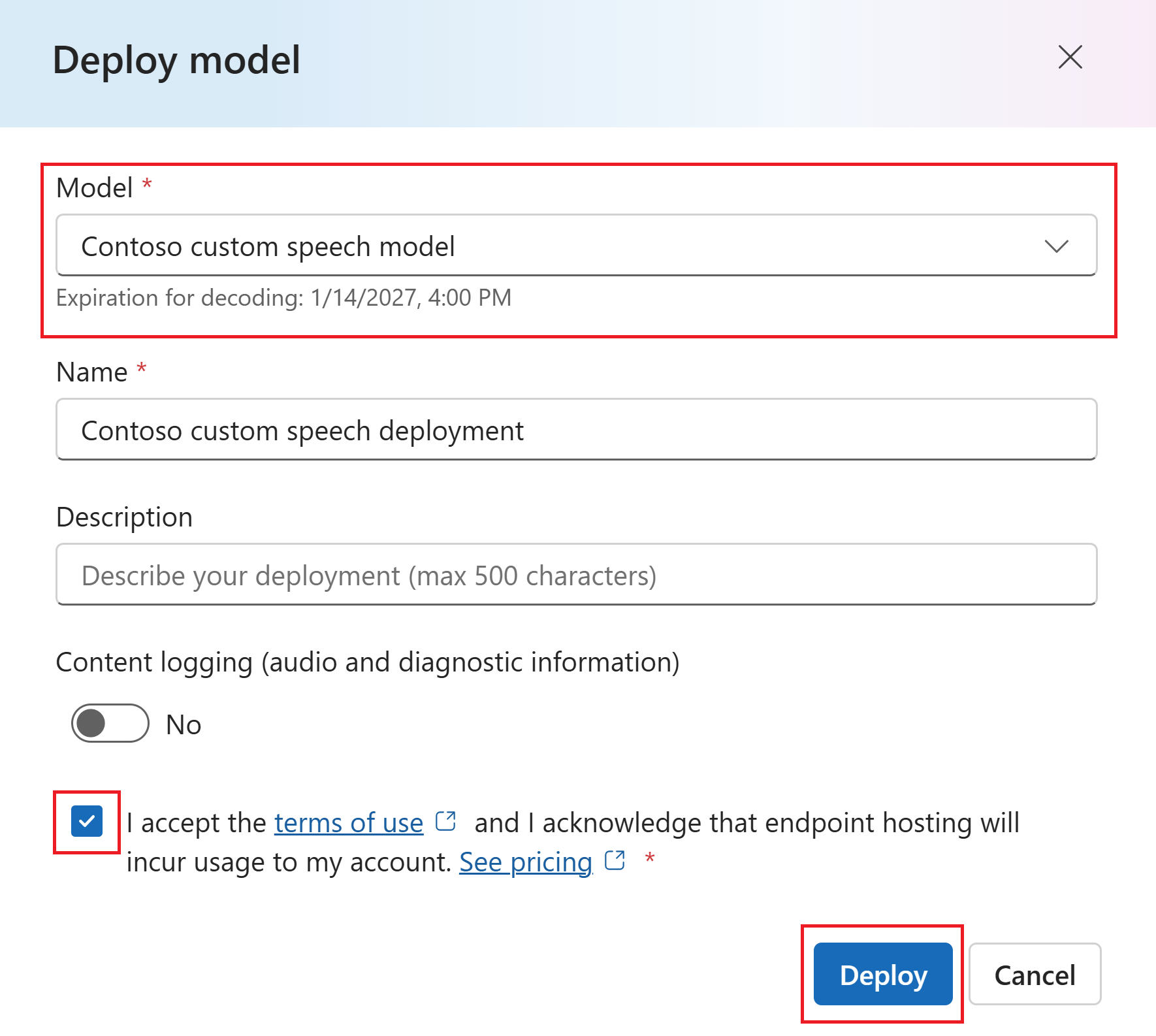 Escriba un nombre y una descripción para la implementación. Seleccione el cuadro para aceptar los Términos de uso. Después, seleccione Implementar.