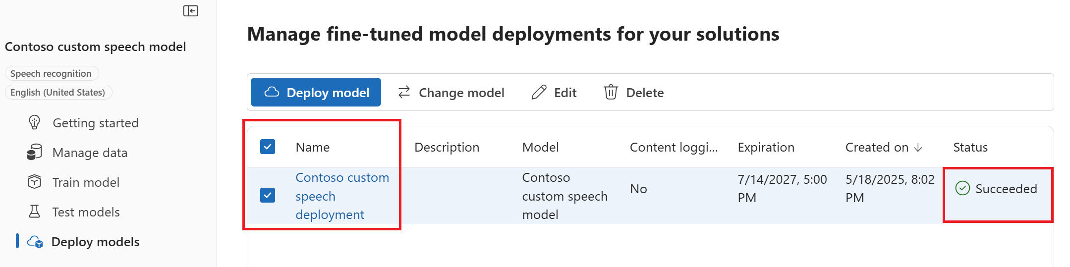En la página principal Implementar modelos, los detalles sobre el nuevo punto de conexión se muestran en una tabla, como el nombre, la descripción, el estado y la fecha de expiración. Se puede tardar hasta 30 minutos en crear una instancia de un nuevo punto de conexión que use los modelos personalizados. Cuando el estado de la implementación cambie a Correcta, el punto de conexión estará listo para su uso.