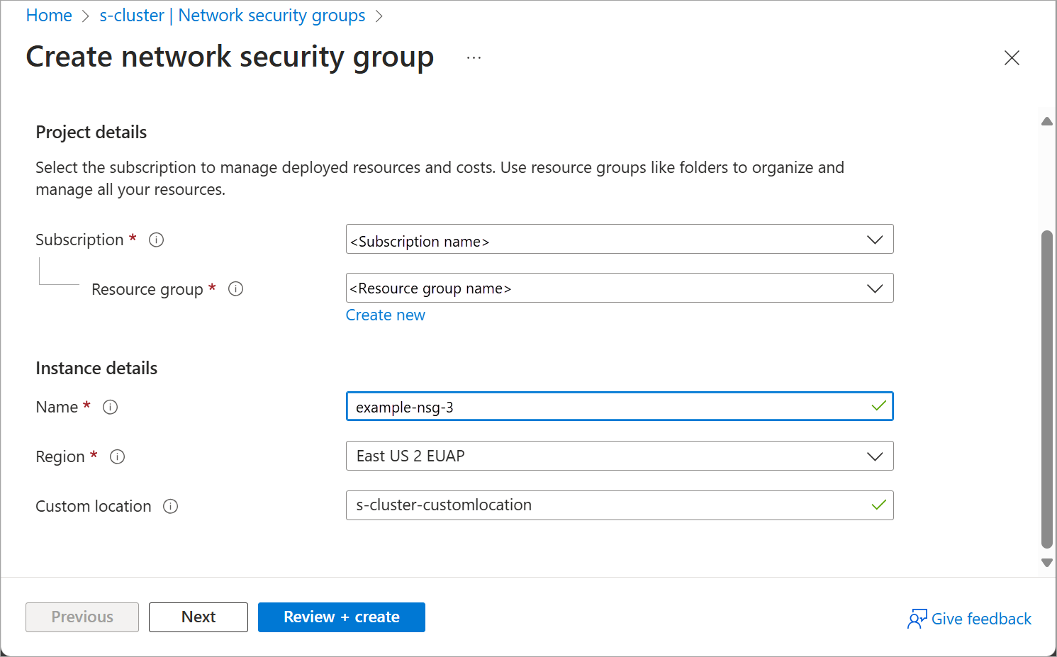 Para facilitar la administración, se recomienda usar la misma ubicación que la instancia local de Azure.grupo de recursos Nombre del grupo de recursos donde se crea el grupo de seguridad de red. Para facilitar la administración, se recomienda usar el mismo grupo de recursos que azure local. suscripción Nombre o identificador de la suscripción donde se implementa Azure Local. ubicación personalizada Ubicación personalizada asociada a Azure Local. Ejecute el comando siguiente para crear un grupo de seguridad de red (NSG) en la instancia local de Azure.