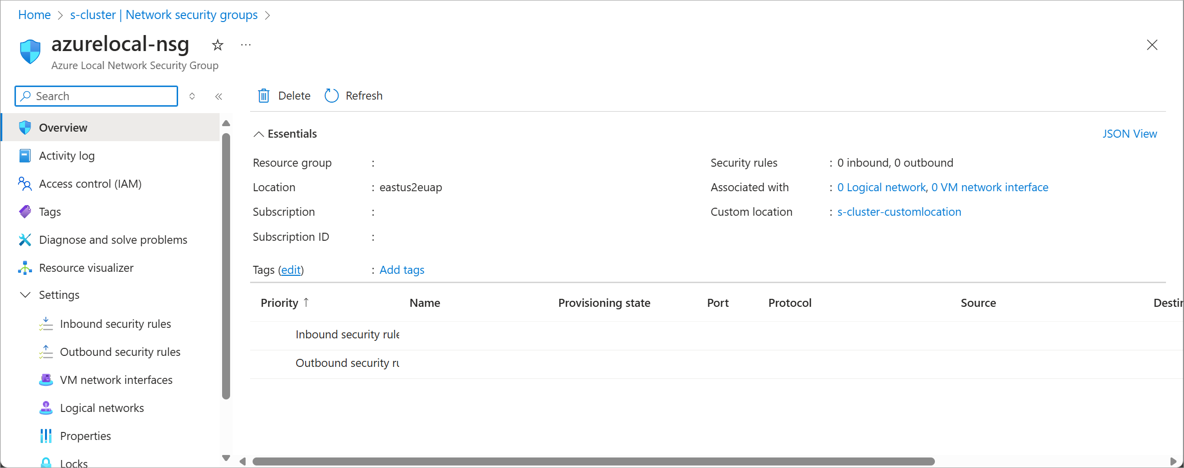 { "eTag": null, "extendedLocation": { "name": "/subscriptions/<Subscription ID>/resourcegroups/examplerg/providers/microsoft.extendedlocation/customlocations/examplecl", "type": "CustomLocation" }, "id": "/subscriptions/<Subscription ID>/resourceGroups/examplerg/providers/Microsoft.AzureStackHCI/networkSecurityGroups/examplensg", "location": "eastus", "name": "examplensg", "properties": { "networkInterfaces": [], "provisioningState": "Succeeded", "subnets": [] }, "resourceGroup": "examplerg", "systemData": { "createdAt": "2025-03-11T22:56:05.968402+00:00", "createdBy": "gus@contoso.com", "createdByType": "User", "lastModifiedAt": "2025-03-11T22:56:13.438321+00:00", "lastModifiedBy": "<User ID>", "lastModifiedByType": "Application" }, "tags": null, "type": "microsoft.azurestackhci/networksecuritygroups" }