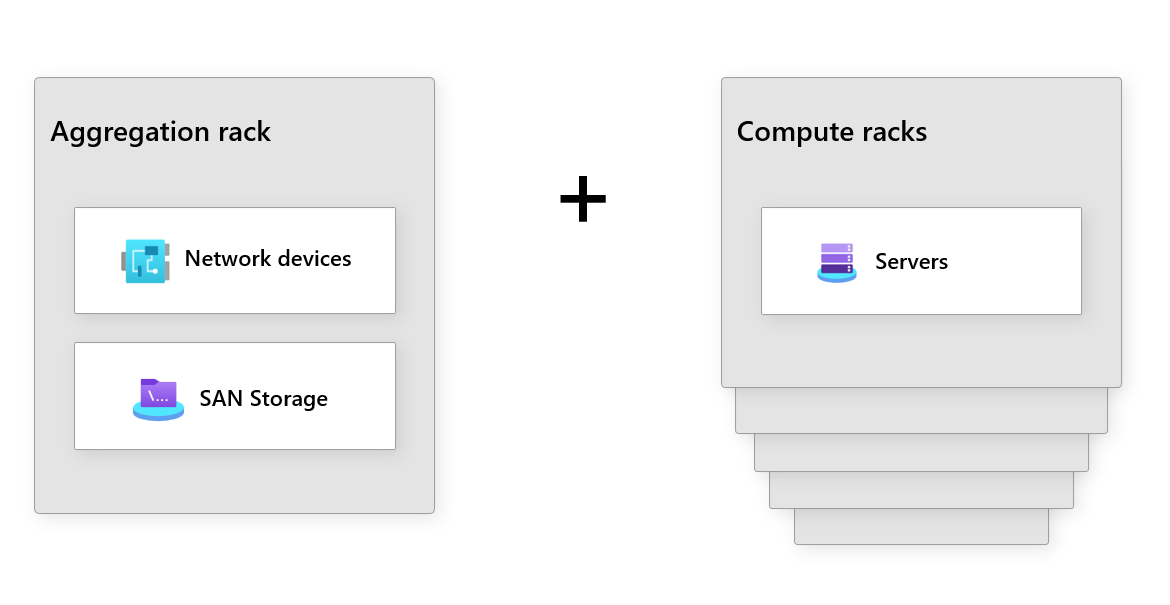 | Equipamiento | Hardware prescriptivo adquirido de un asociado de hardware de Microsoft. Cada instancia tiene un bastidor principal para la agregación de red y el almacenamiento SAN más tres o más bastidores de proceso. La superficie mínima es de cuatro bastidores. |