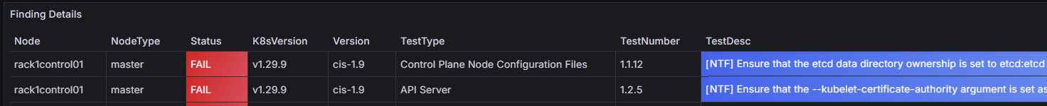 En la imagen siguiente se muestran las excepciones de Kube-Bench para el Cluster Manager. Consulte un informe completo de la evaluación de control de CIS Benchmark para Azure Kubernetes Service (AKS).