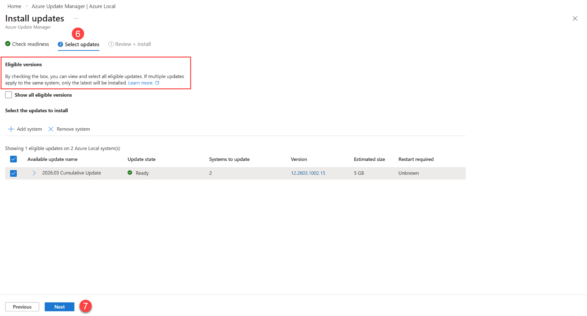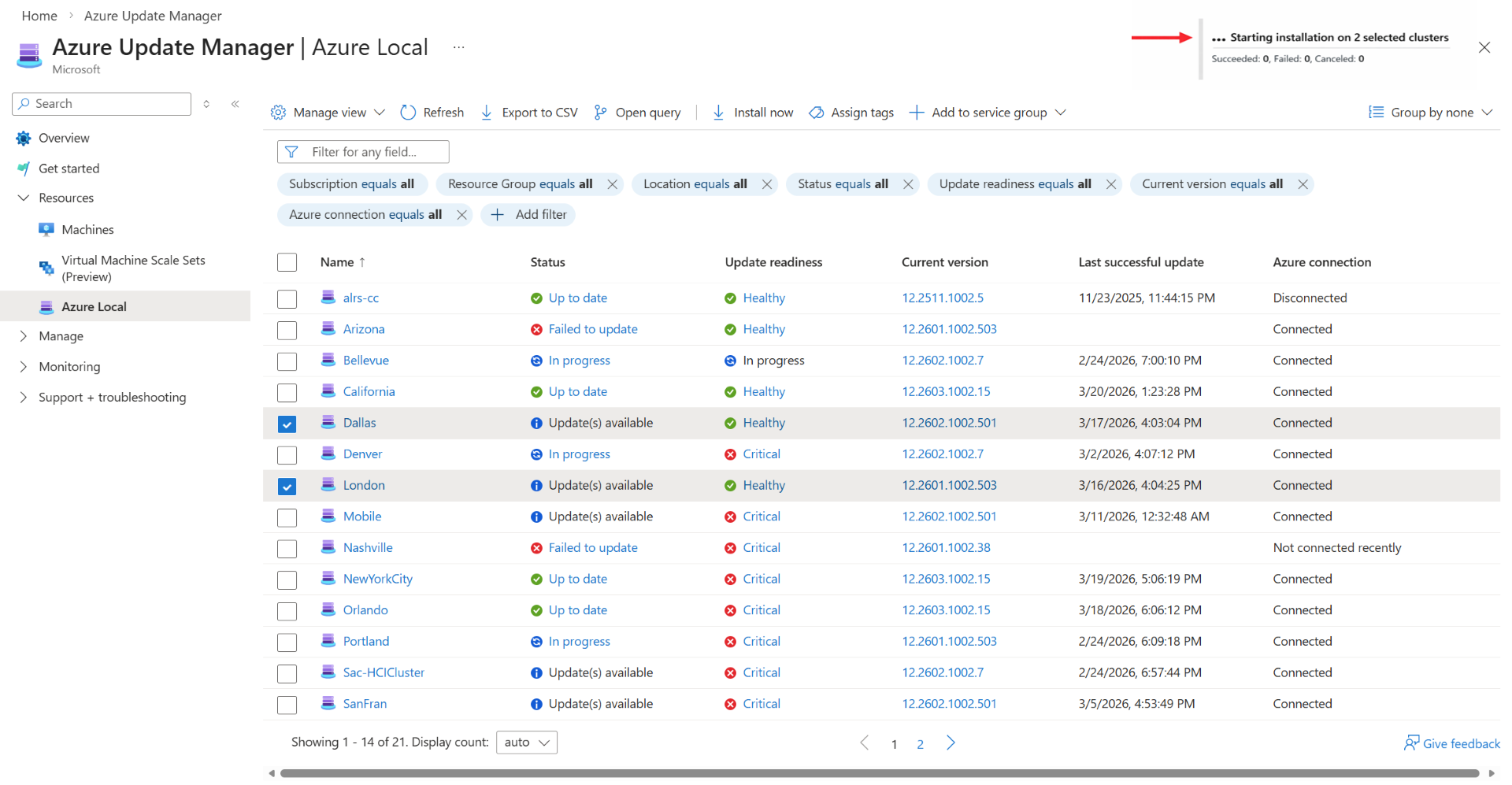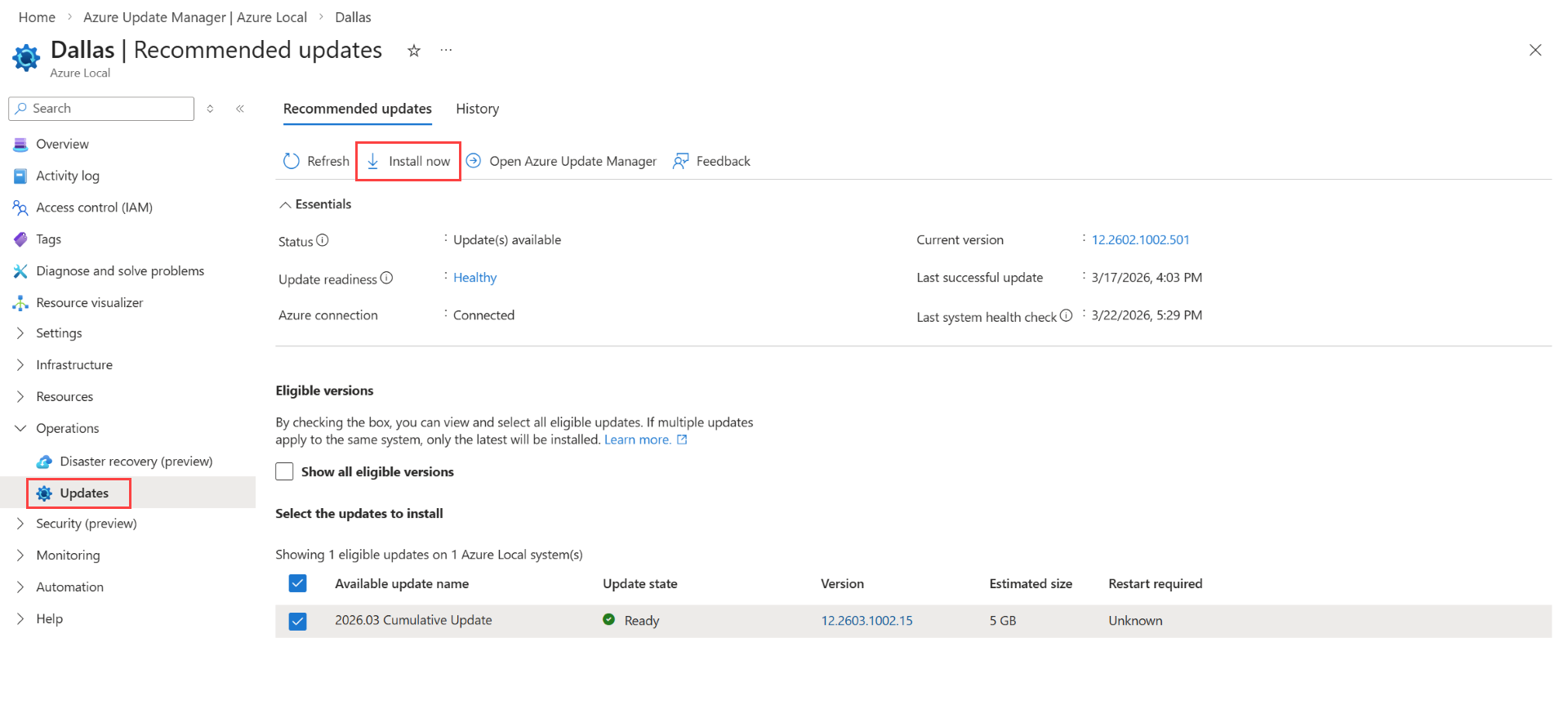 - Asegúrese de aplicar actualizaciones a través de rutas de navegación admitidas en Azure Portal. Microsoft solo admite actualizaciones aplicadas desde la página de recursos locales de Azure o a través de los recursos > de Azure Update Manager > Azure Local. Además, no se admite el uso de herramientas de terceros para instalar actualizaciones.