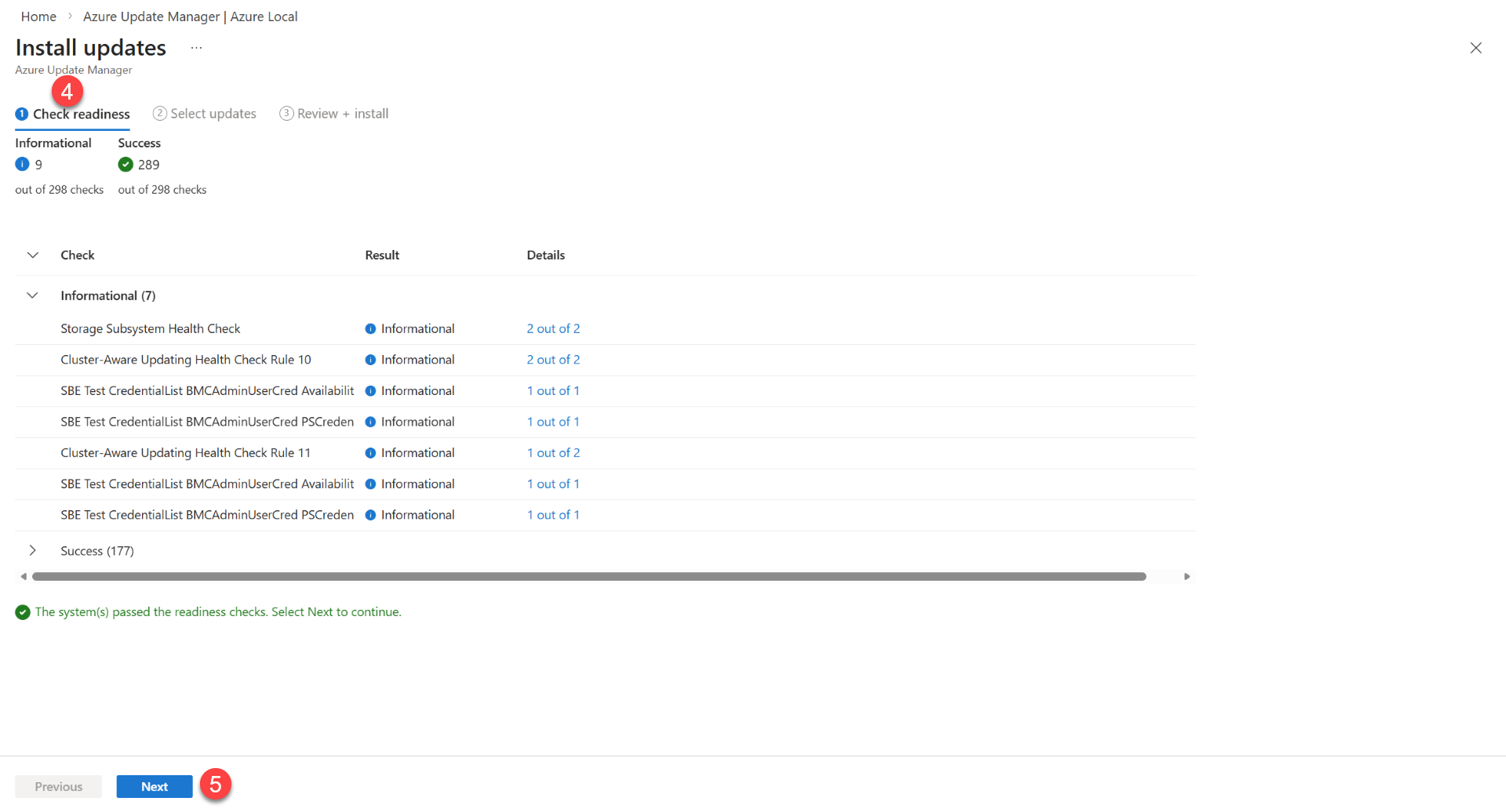 Es habitual que los resultados de las comprobaciones de estado del sistema y las comprobaciones de preparación de actualizaciones difieran. Esto sucede porque las comprobaciones de preparación de actualizaciones usan la lógica de validación más reciente de la actualización de la solución que se va a instalar, mientras que las comprobaciones de estado del sistema siempre usan la lógica de validación de la versión instalada.