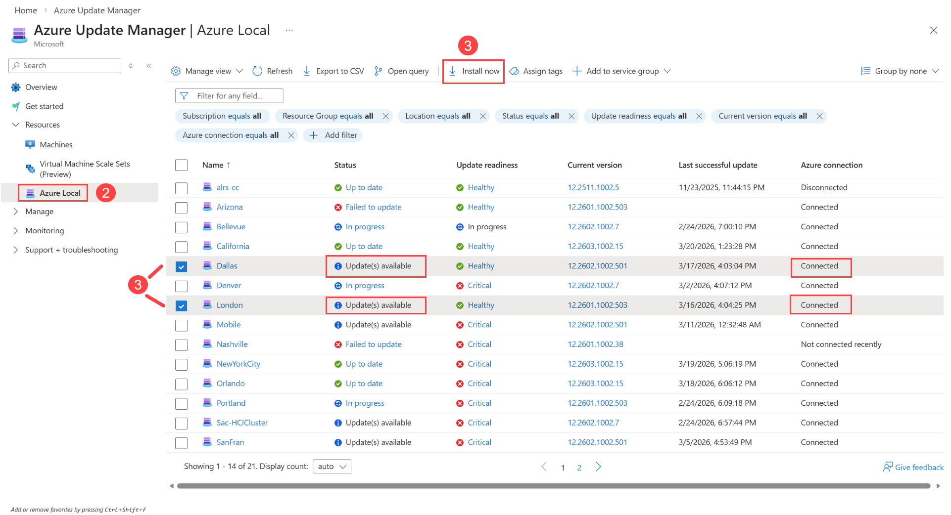 - Vea y seleccione las actualizaciones disponibles para instalar en las máquinas locales de Azure.