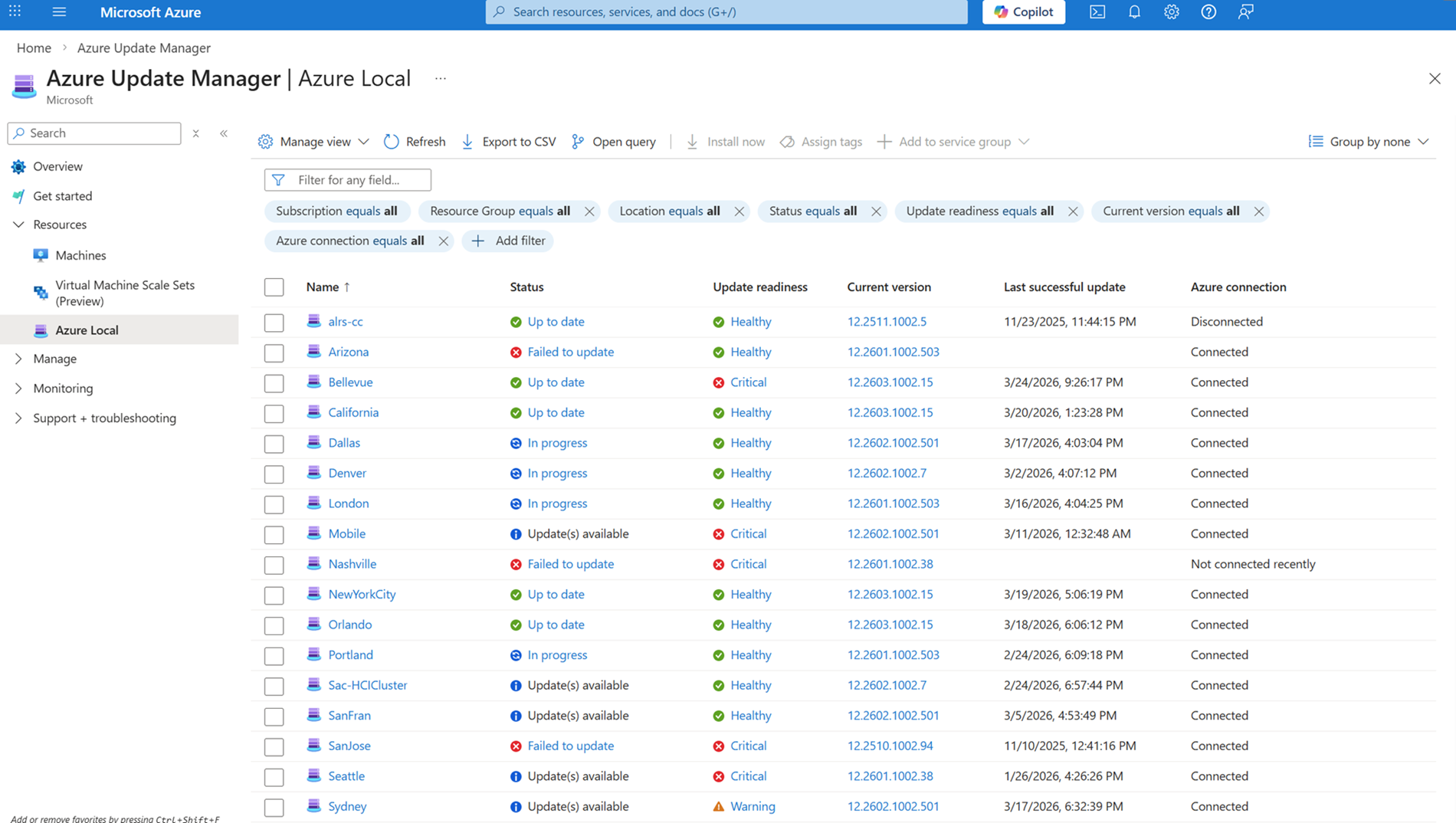 - Filtre por suscripción, grupo de recursos, ubicación, estado, preparación de actualizaciones, versión actual o etiquetas para ver una lista de sistemas.