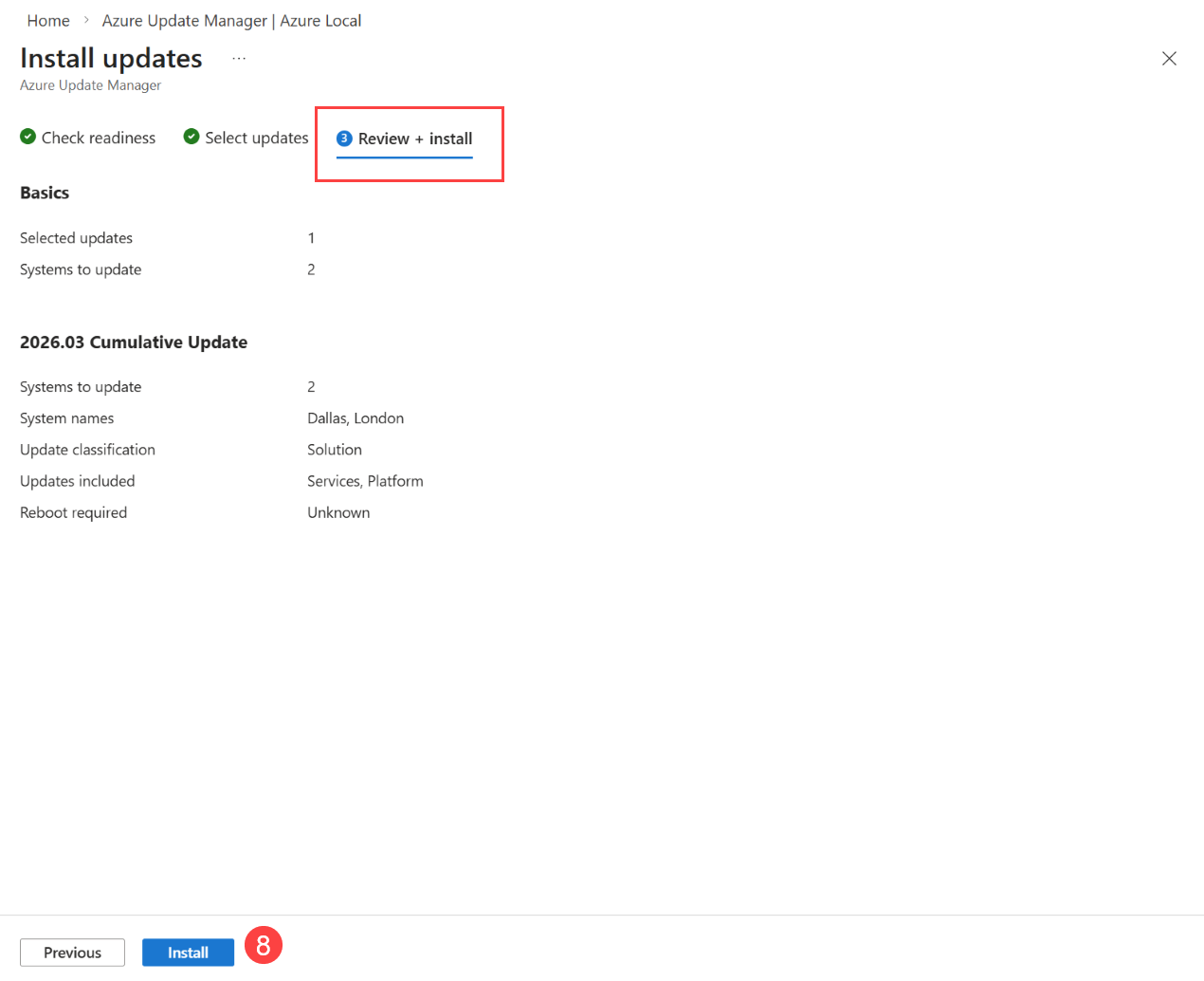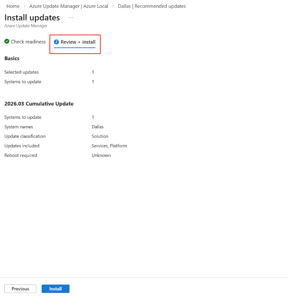 En la página Revisar e instalar , compruebe las opciones de implementación de actualizaciones y, a continuación, seleccione Instalar.