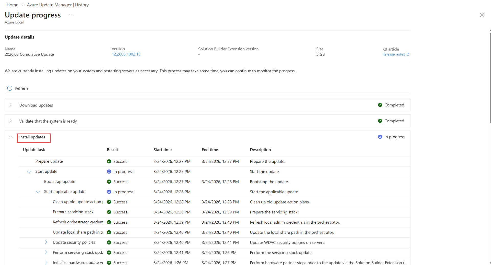 Puede usar el Administrador de actualizaciones de Azure para realizar un seguimiento del progreso de las actualizaciones de Azure Local, independientemente del método que use para iniciar las actualizaciones. Esto significa que puede comprobar el progreso de las actualizaciones iniciadas a través de PowerShell, la página de recursos de Azure Local o el Administrador de actualizaciones de Azure.
