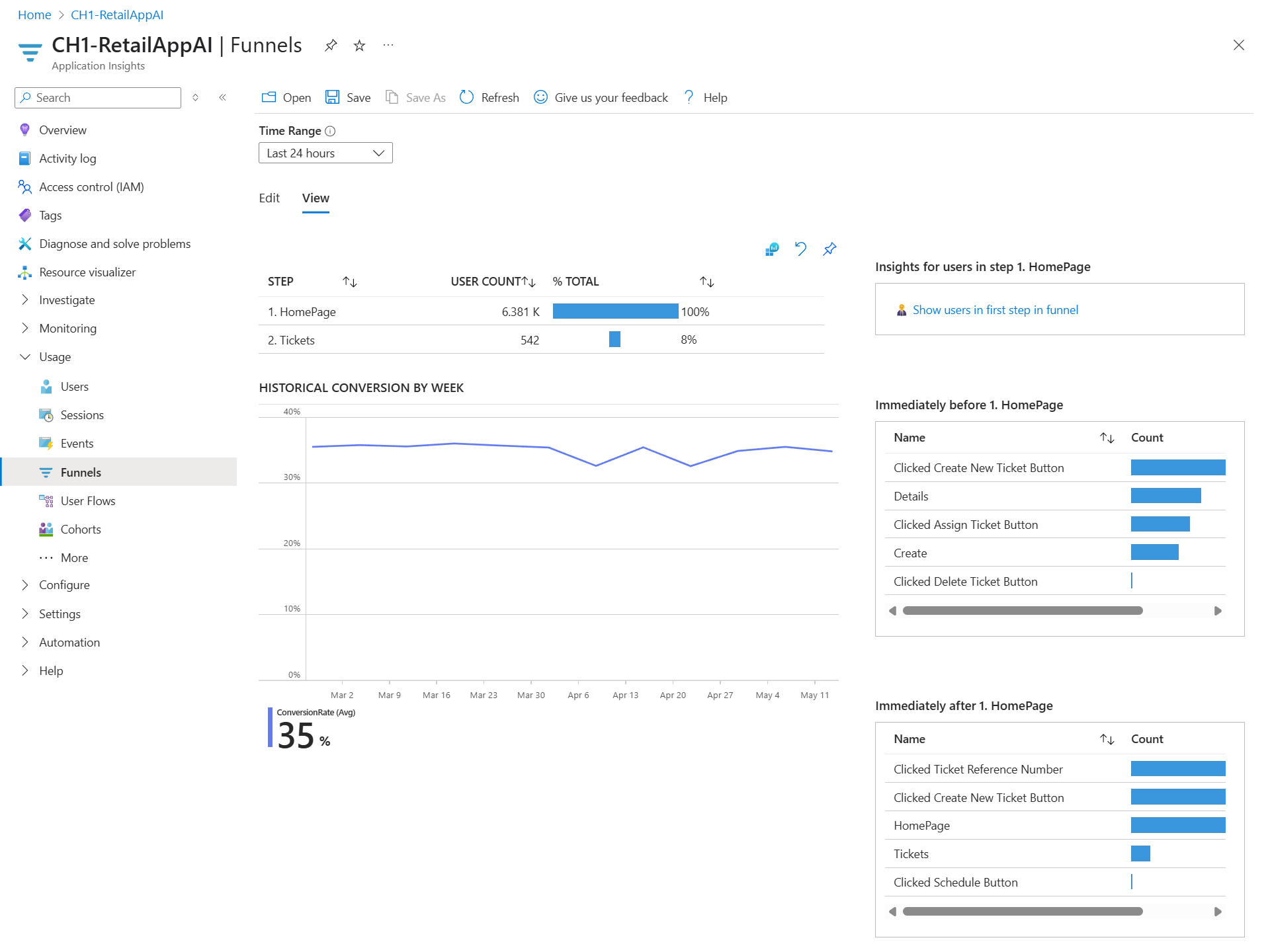 Puede usar embudos de Application Insights para obtener información sobre los usuarios y supervisar las tasas de conversión paso a paso. Al seleccionar un paso se muestran detalles adicionales específicos del paso.