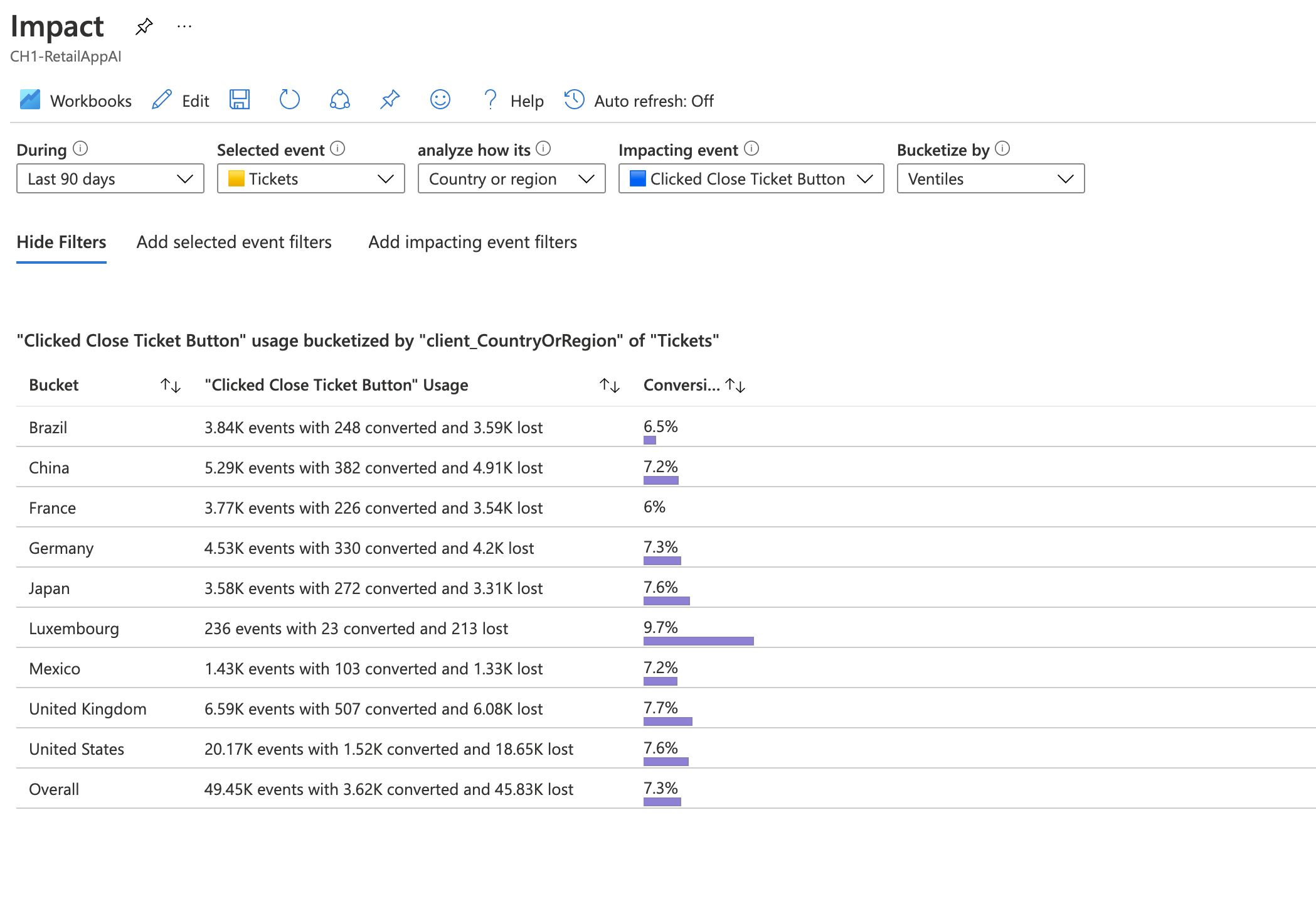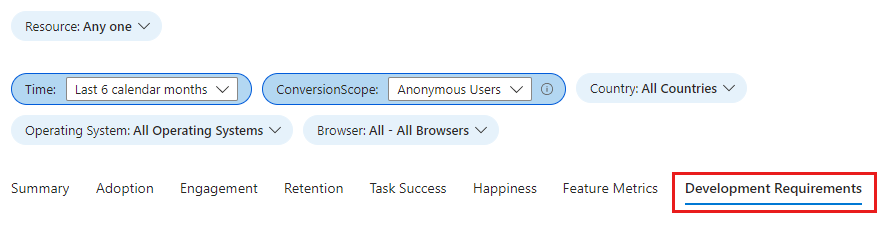 A menos que establezca el contexto de usuario autenticado, debe seleccionar Usuarios anónimos en la lista desplegable ConversionScope para ver los datos de telemetría.