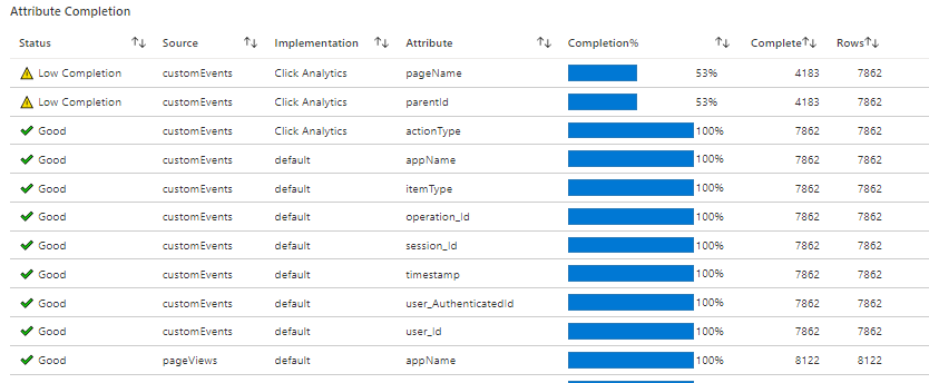 Fuente Atributo Descripción customEvents user_AuthenticatedId Identificador de usuario autenticado único customEvents id_de_sesión Identificador único de la sesión customEvents Nombre de la aplicación Identificador único de la aplicación de Application Insights customEvents tipo de artículo Categoría del registro de customEvents customEvents marca de tiempo Fecha y hora del evento customEvents identificador_de_operación Correlación de los eventos de telemetría customEvents user_Id Identificador de usuario único eventos personalizados ¹ parentId Nombre de la característica eventos personalizados ¹ Nombre de la página Nombre de la página eventos personalizados ¹ tipo de acción Categoría del registro de Click Analytics vistas de página user_AuthenticatedId Identificador de usuario autenticado único vistas de página id_de_sesión Identificador único de la sesión vistas de página Nombre de la aplicación Identificador único de la aplicación de Application Insights vistas de página marca de tiempo Fecha y hora del evento vistas de página identificador_de_operación Correlación de los eventos de telemetría vistas de página user_Id Identificador de usuario único ¹: Para emitir estos atributos, use el complemento Autocollection de Click Analytics a través de npm.