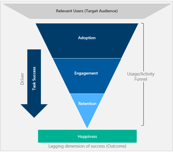 - La adopción, la involucración y la retención forman un embudo de actividad de usuario. Solo una parte de los usuarios que adoptan la herramienta vuelve a usarla.