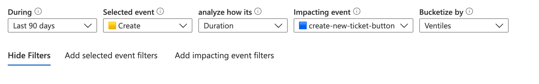 Impact permite tanto propiedades como medidas estándar y personalizadas. así que puede usar lo que prefiera. En lugar de duración, use filtros en los eventos principales y secundarios para obtener datos más específicos.