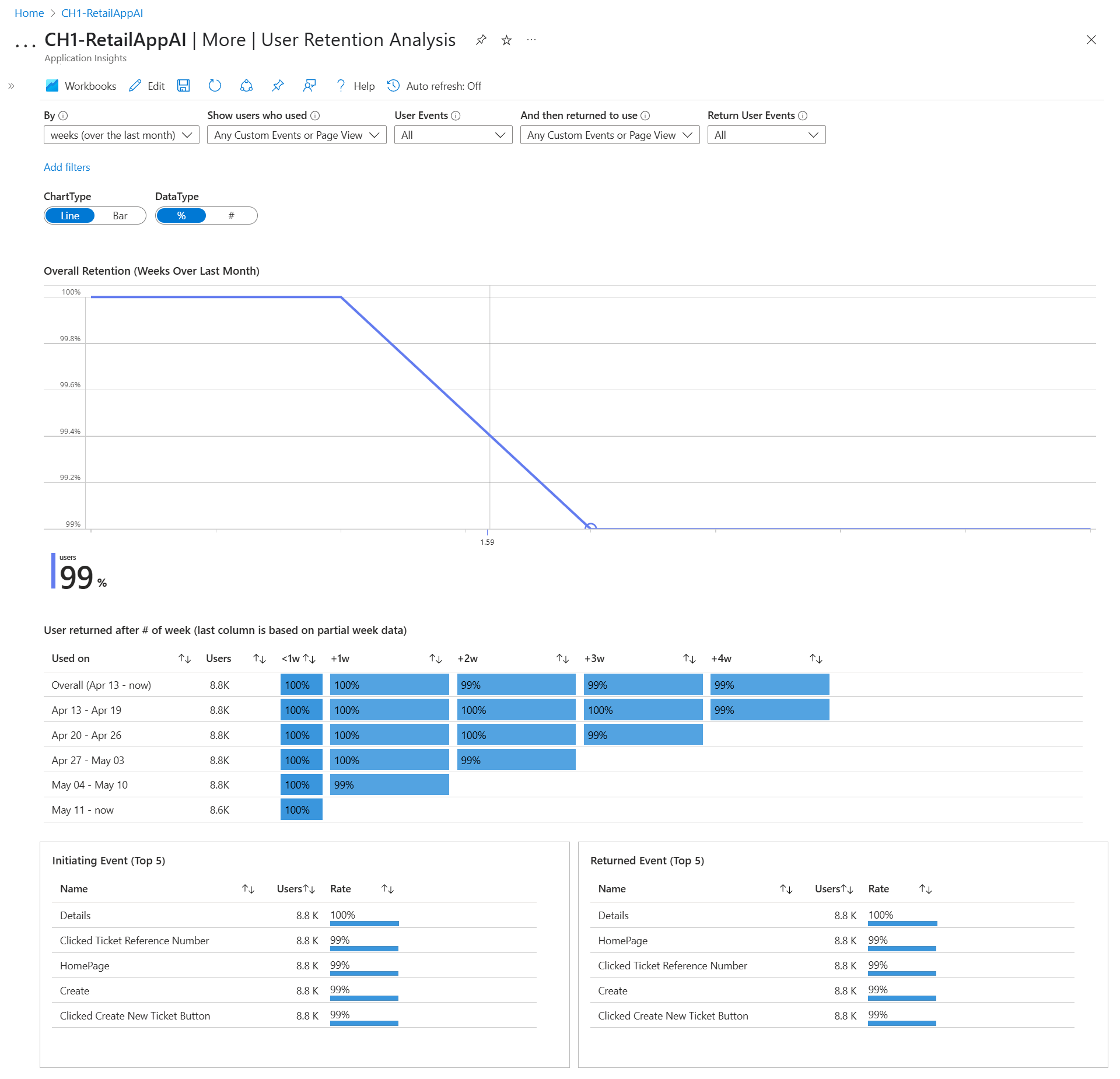 Dado que los usuarios activos deben tener al menos un evento de telemetría con un tipo de acción, las métricas de retención requieren que se implemente el complemento Click Analytics para Application Insights en la aplicación.