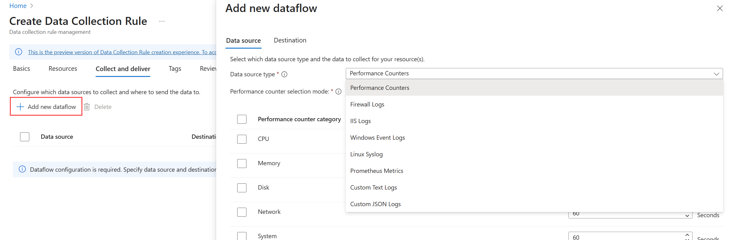 En el panel Recopilar y entregar , haga clic en Agregar origen de datos para agregar y configurar orígenes de datos y destinos para el DCR. Puede optar por agregar varios orígenes de datos al mismo DCR o crear varios DCR con orígenes de datos diferentes. Un DCR puede tener hasta 10 orígenes de datos y una máquina virtual puede usar cualquier número de DCR.