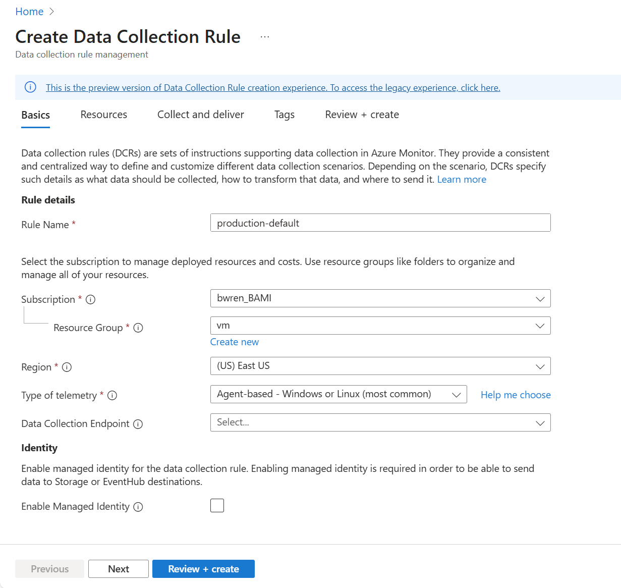 Si tiene requisitos básicos de recopilación de datos, debe poder cumplir todos sus requisitos mediante las instrucciones de este artículo y los artículos relacionados sobre cada origen de datos. Puede usar Azure Portal para crear y editar el DCR y el agente de Azure Monitor se instala automáticamente en cada máquina virtual que aún no la tenga.