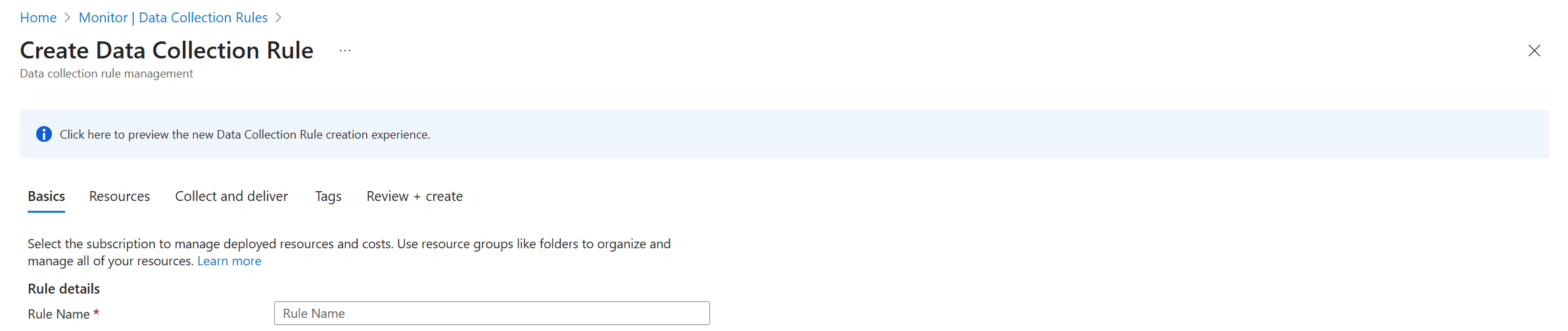 Ahora hay disponible una experiencia de versión preliminar para crear DCR en Azure Portal. Seleccione la pestaña siguiente para obtener instrucciones sobre la experiencia que desea usar.
