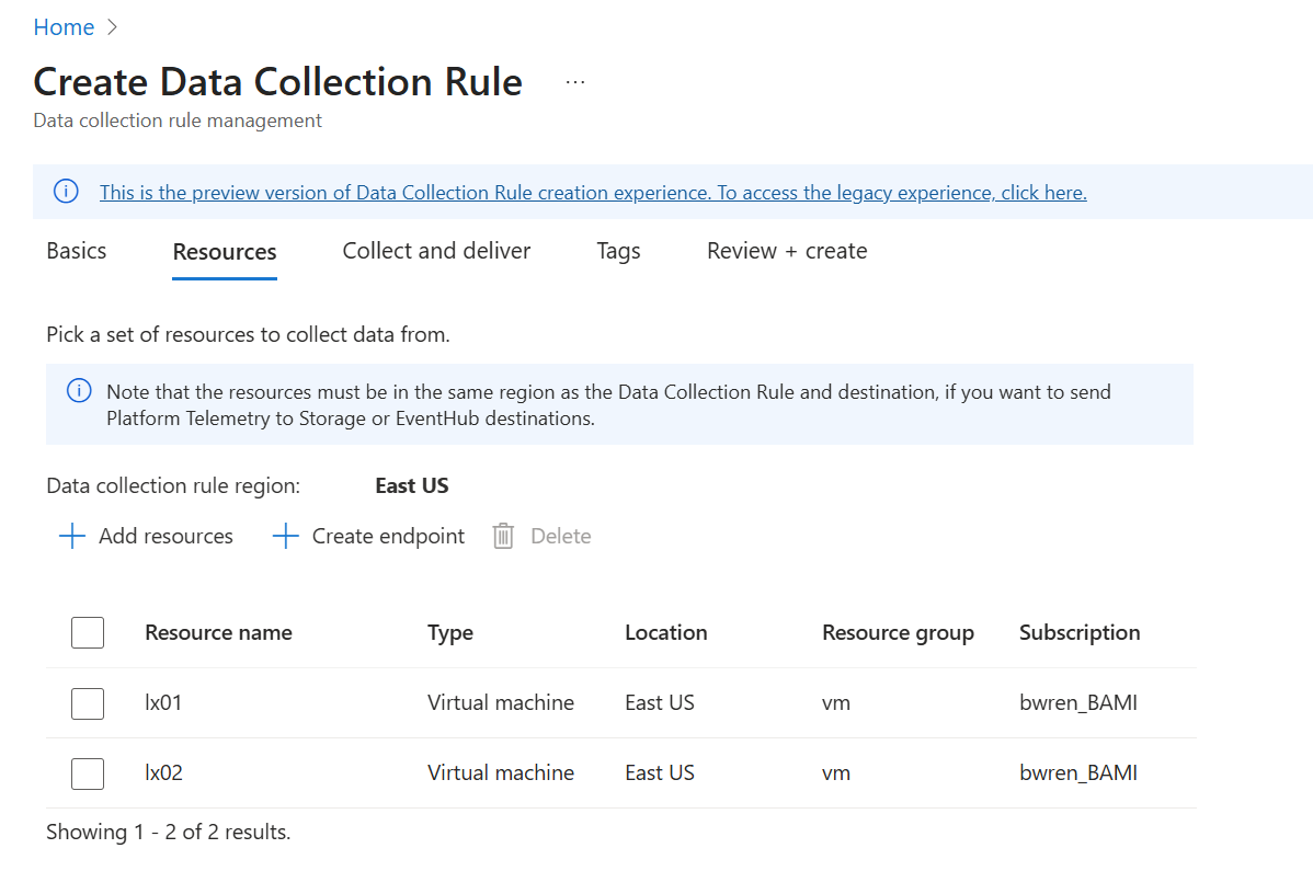 En el panel Recursos , seleccione Agregar recursos para agregar máquinas virtuales que usarán DCR. Aún no es necesario agregar ninguna máquina virtual, ya que puede actualizar el DCR después de la creación y añadir o eliminar cualquier recurso. Si selecciona Habilitar puntos de conexión de recopilación de datos en la pestaña Recursos , puede seleccionar un DCE para cada máquina virtual. Esto solo es necesario si usa vínculos privados de Azure Monitor. De lo contrario, no seleccione esta opción.