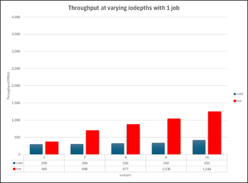 En el gráfico siguiente se muestra el rendimiento del nivel de acceso esporádico para esta prueba mediante una variedad de profundidades de cola. El rendimiento máximo de una sola máquina virtual fue de aproximadamente 400 MiB/s.