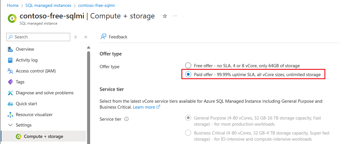 Seleccione la instancia gratuita que desea actualizar para ir a la página Información general de SQL Managed Instance.