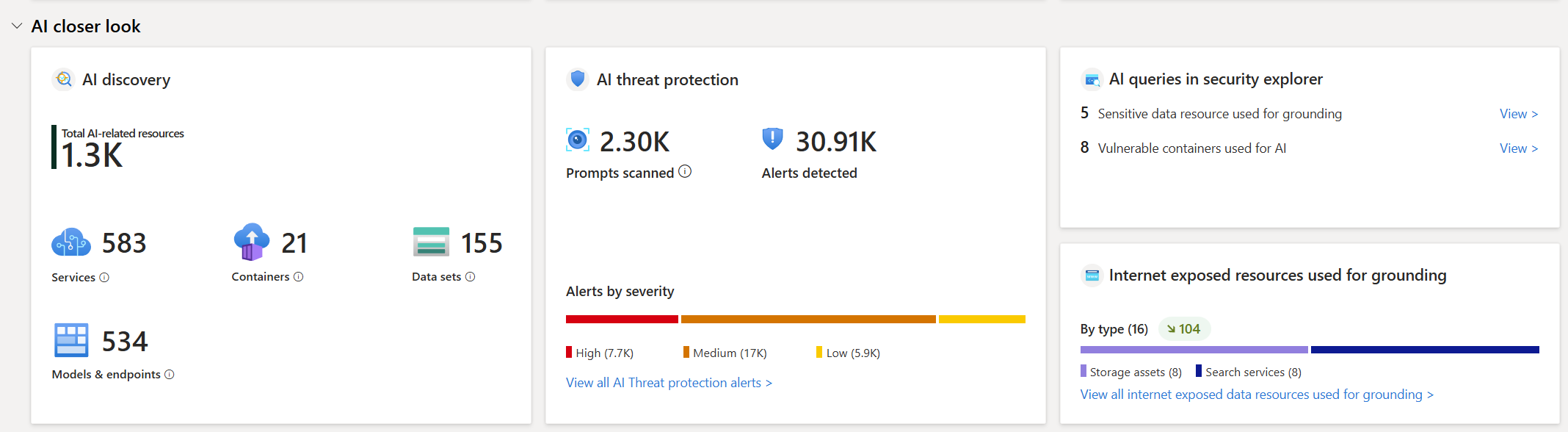 Consultas de IA en el explorador de seguridad: proporciona consultas que ayudan en las investigaciones relacionadas con los riesgos de la IA, como los recursos de datos confidenciales usados para la fundamentación y los contenedores vulnerables usados para la IA.