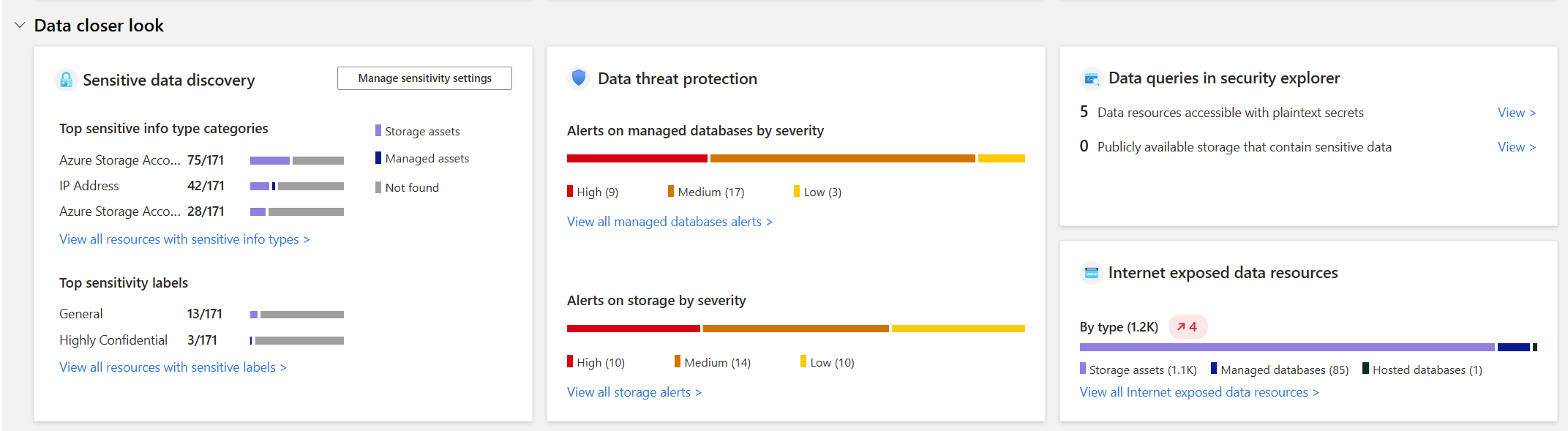 Recursos de datos expuestos a Internet: proporciona una visión general de los recursos expuestos a Internet, clasificados por recursos de almacenamiento, bases de datos administradas y bases de datos hospedadas. Estos recursos son vulnerables a posibles amenazas.