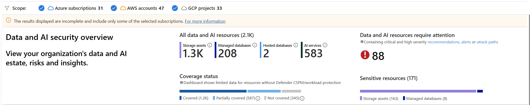 La característica del panel de seguridad de datos está habilitada en el nivel de suscripción. La información del panel de control se basa en los datos y recursos de IA de su suscripción y en los planes habilitados en la misma.