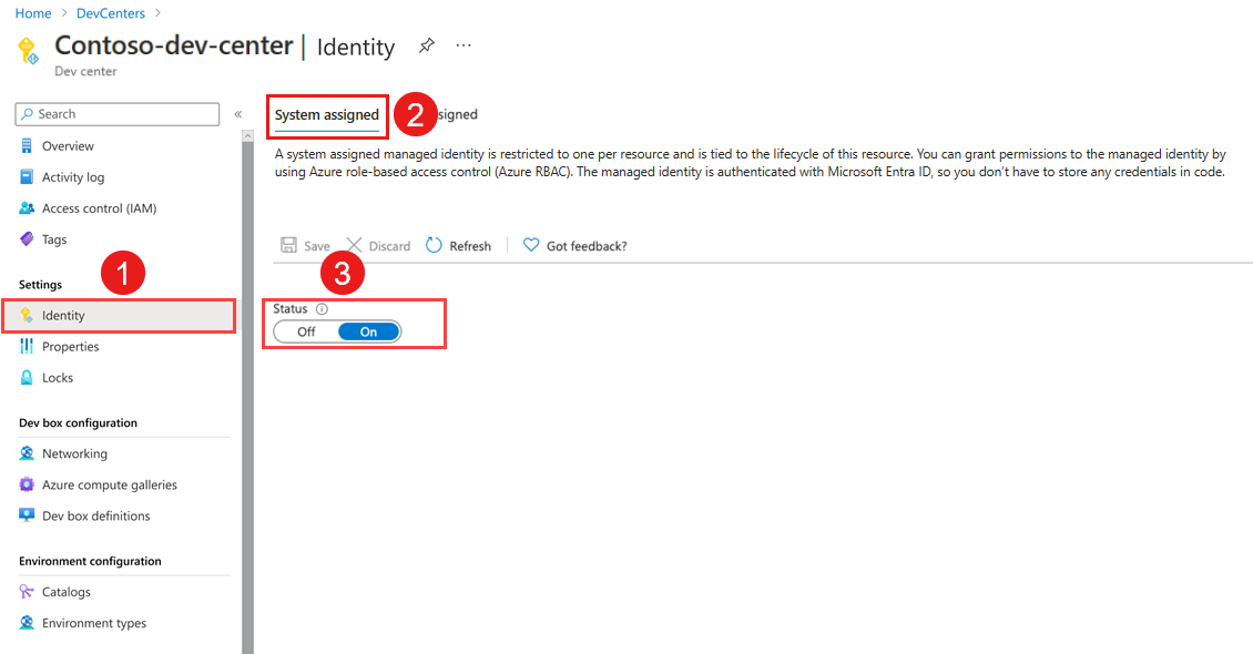 En este inicio rápido, configura una identidad administrada asignada por el sistema para el centro de desarrollo. A continuación, asigne roles a la identidad administrada para permitir que el centro de desarrollo cree tipos de entorno en la suscripción.