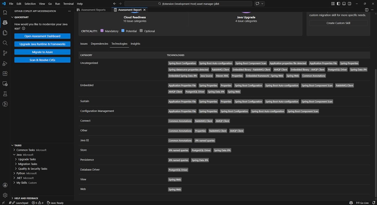 - Seleccione Start Assessment (Iniciar evaluación ) o Open Assessment Dashboard (Abrir panel de evaluación) en la sección QUICKSTART del panel de modernización de GitHub Copilot.
