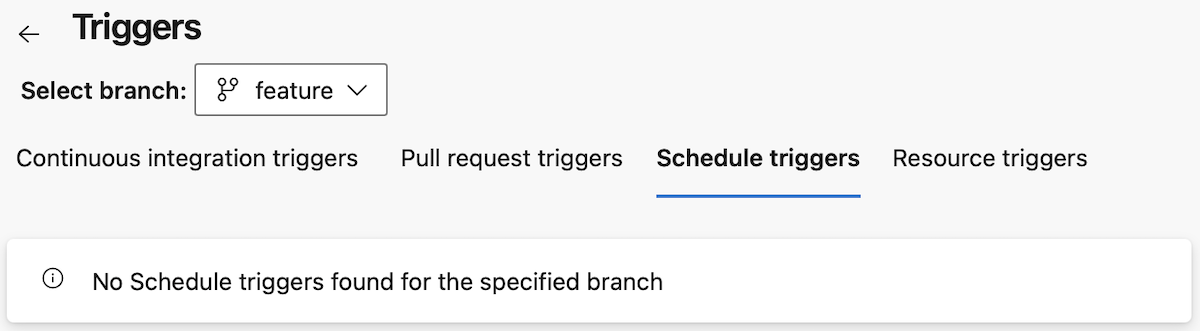 En la pestaña Desencadenadores de recursos, cuando no está en la rama predeterminada, aparece una advertencia que indica que se omiten los desencadenadores definidos para esta rama.