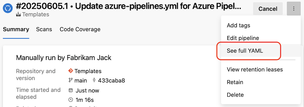 - Consulte el código YAML completo de una ejecución de canalización.