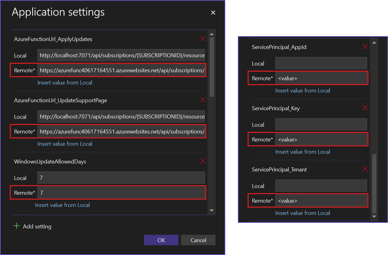 Además de la dirección URL de cada función, también es necesario actualizar la información sobre la entidad de seguridad del servicio, incluidos el ID de aplicación, la clave y el ID de inquilino.