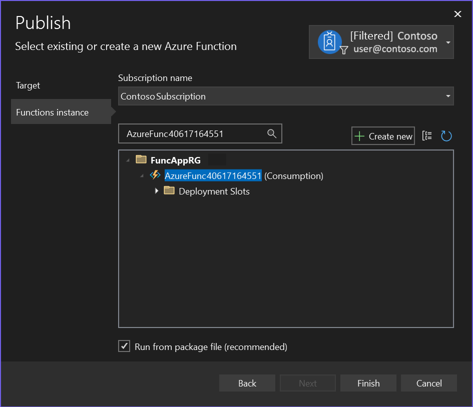 Complete los pasos del Asistente para publicar una aplicación de funciones de Azure nueva o existente: