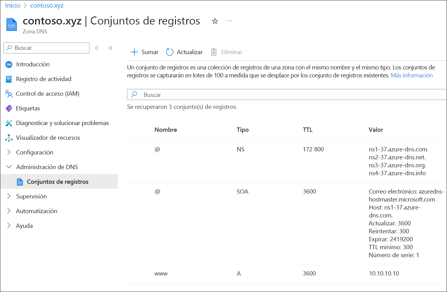 En Azure Portal, en Recursos, abra la zona DNS de contoso.xyz.