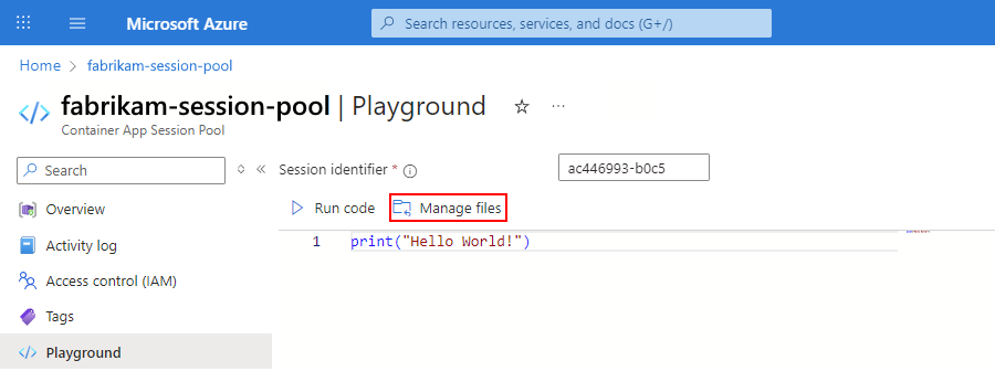 Para administrar archivos o ejecutar código en el grupo de sesiones, asegúrese de tener el rol integrado de Azure denominado Ejecutor de sesión de Azure ContainerApps en el grupo de sesiones. Para esta tarea, consulte Concesión de acceso de identidad a los recursos.