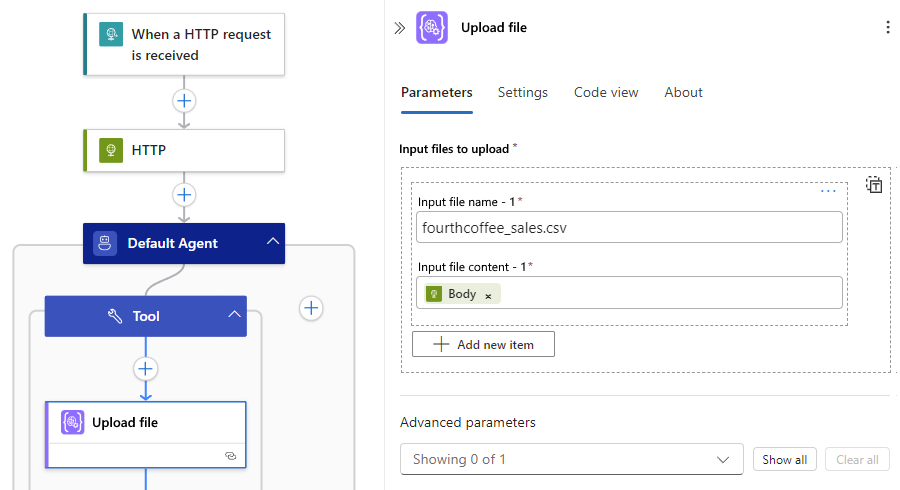 Parámetro Importancia Description Nombre de archivo de entrada < file-name> Nombre que se va a asignar para el archivo. Contenido del archivo de entrada < file-content> Ruta de acceso del contenido del archivo que se va a cargar. En el ejemplo siguiente, el flujo de trabajo usa una acción HTTP, que realiza una llamada REST para obtener el archivo de su ubicación de origen. La acción de bucle del agente tiene una herramienta que usa la acción Cargar archivo con el nombre de archivo y el contenido como parámetros. El nombre de archivo es una entrada manual, mientras que el contenido del archivo hace referencia a la salida de la acción HTTP anterior: