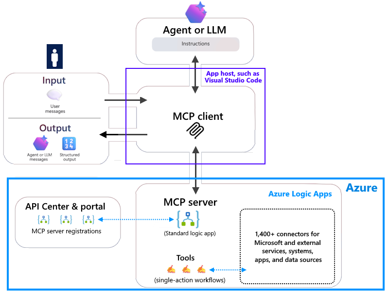Mediante el Centro de API de Azure, puede crear y registrar un servidor MCP con herramientas controladas por acciones de conector precompiladas en Azure Logic Apps. Normalmente, se usan acciones y desencadenadores de conectores en Azure Logic Apps para crear flujos de trabajo para soluciones de automatización e integración. Con acceso a más de 1400 conectores que funcionan con una amplia gama de servicios en la nube, sistemas locales, aplicaciones y datos, puede crear diversos conjuntos de herramientas que interactúen con sus activos y recursos empresariales.