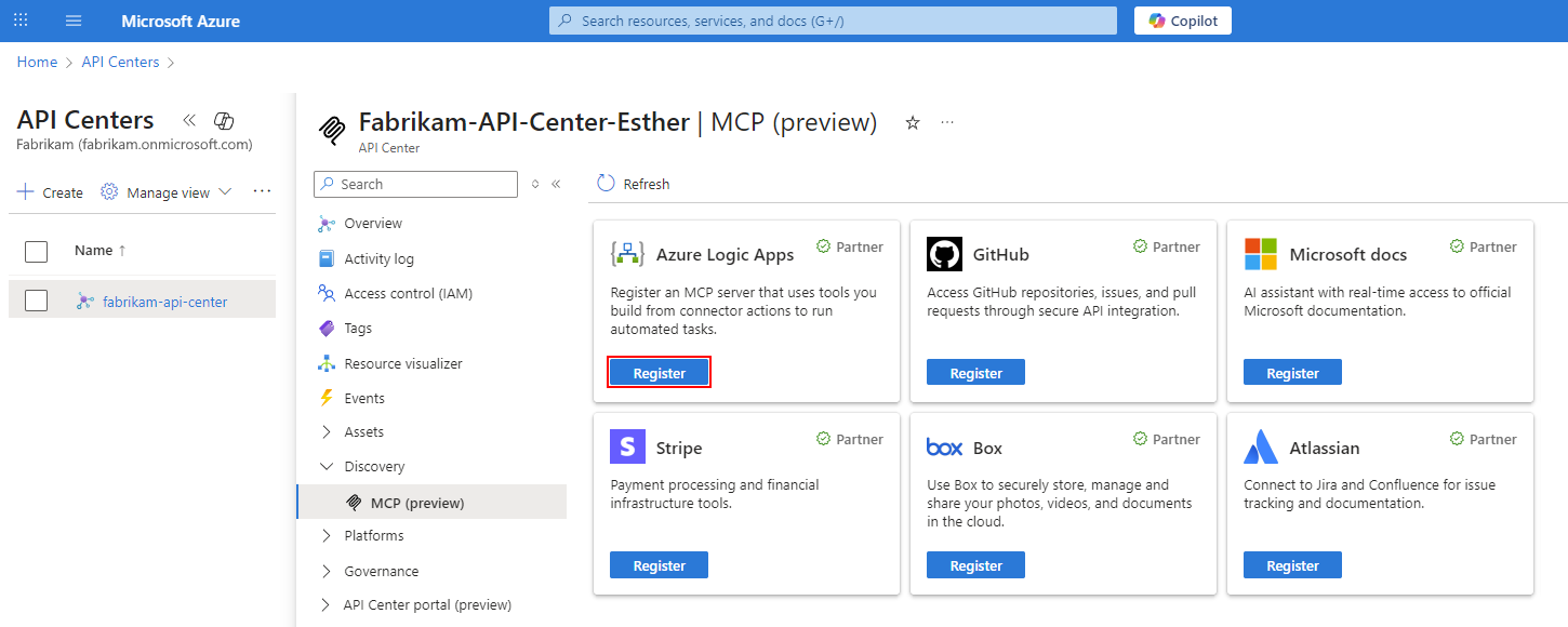 En la página MCP, busque el icono de Azure Logic Apps y seleccione Registrar.