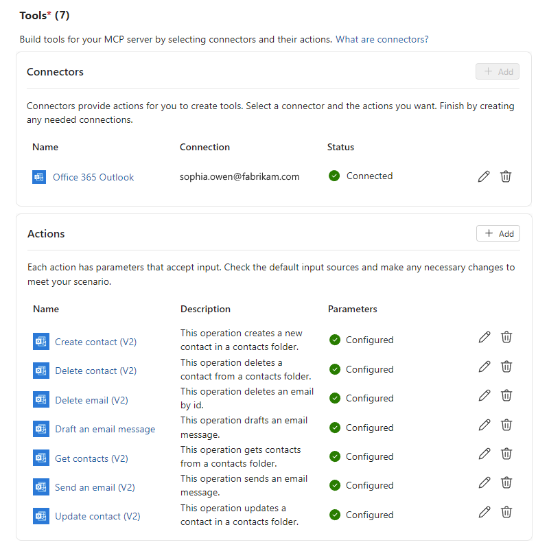 La sección Conectores ahora muestra el conector seleccionado. En la sección Acciones se muestran las acciones seleccionadas que potencian las herramientas que proporciona el servidor de MCP. De forma predeterminada, los parámetros de estas acciones usan un LLM como origen de entrada. Puede cambiar este origen de entrada a proporcionado por el usuario, en función de las necesidades de su escenario.