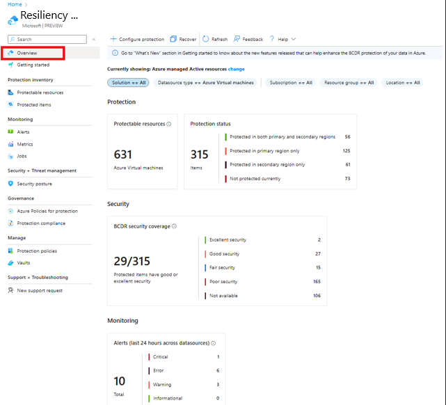 En Resistencia, vaya a Información general para ver una vista consolidada de la información relacionada con la protección de los recursos entre soluciones en una sola ubicación.
