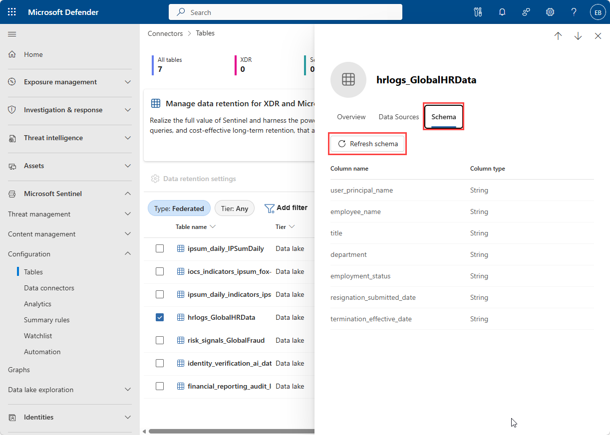 La vista de administración de tablas proporciona información general sobre todas las tablas del lago de datos de Sentinel, incluidas las tablas federadas.