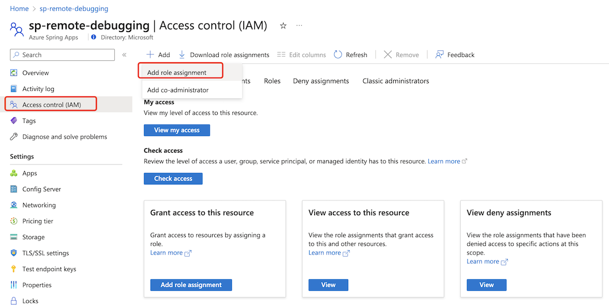 Para depurar de forma remota una instancia de aplicación, se le debe conceder el rol Azure Spring Apps Remote Debugging Role, que incluye el Microsoft.AppPlatform/Spring/apps/deployments/remotedebugging/action permiso de acción de datos.