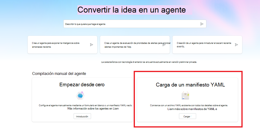 En este artículo se explica cómo crear un agente mediante la creación y carga de un manifiesto YAML en Security Copilot.