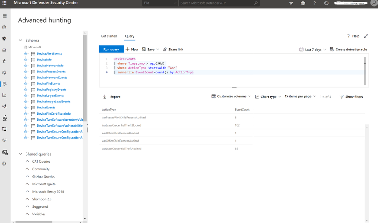 Puede consultar eventos de regla de reducción de superficie expuesta a ataques desde la tabla DeviceEvents en la sección búsqueda avanzada del portal de Microsoft Defender. Por ejemplo, en la consulta siguiente se muestra cómo notificar todos los eventos que tienen reglas de reducción de superficie expuesta a ataques como origen de datos durante los últimos 30 días. A continuación, la consulta se resume mediante el recuento ActionType con el nombre de la regla de reducción de superficie expuesta a ataques.