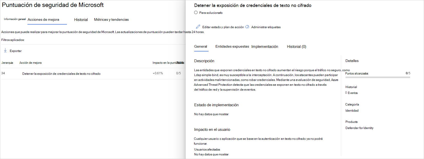 Revise la acción recomendada en https://security.microsoft.com/securescore?viewid=actions para detectar qué cuentas tienen atributos no seguros.