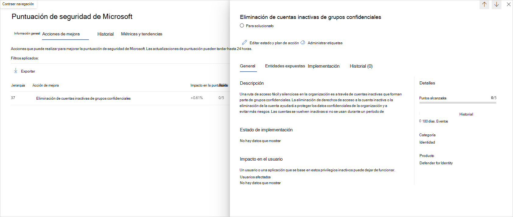 Revise la acción recomendada en https://security.microsoft.com/securescore?viewid=actions para detectar qué cuentas tienen un atributo de historial de SID no seguro.
