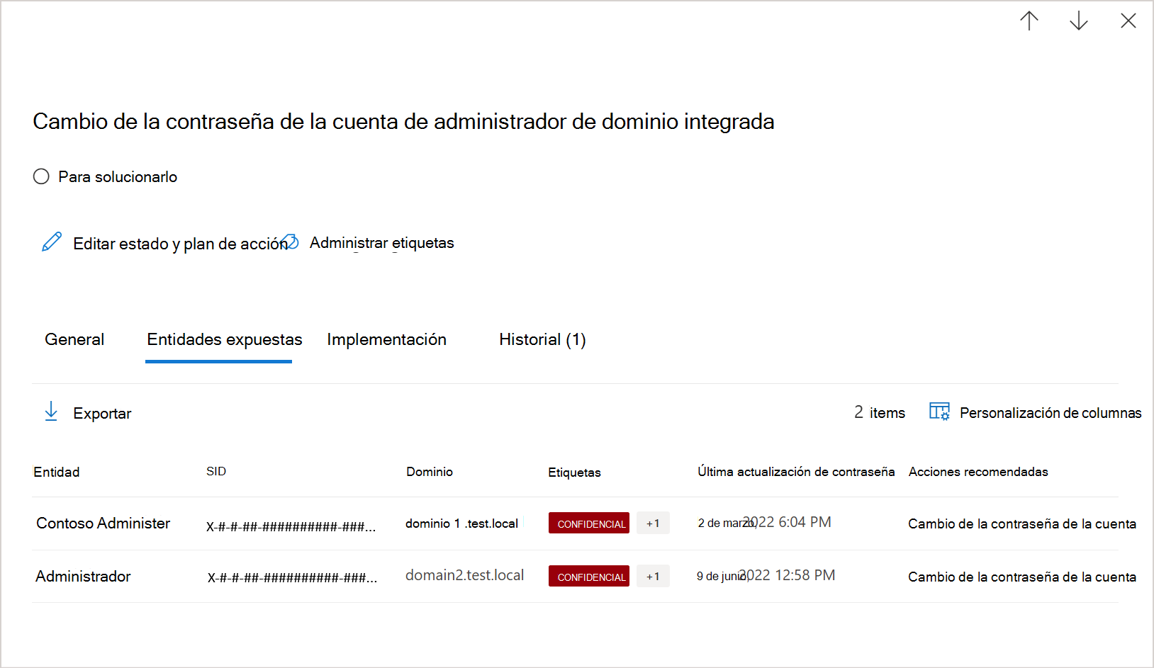 Revise la lista de entidades expuestas para detectar cuáles de las cuentas de administrador de dominio integradas tienen una contraseña antigua.