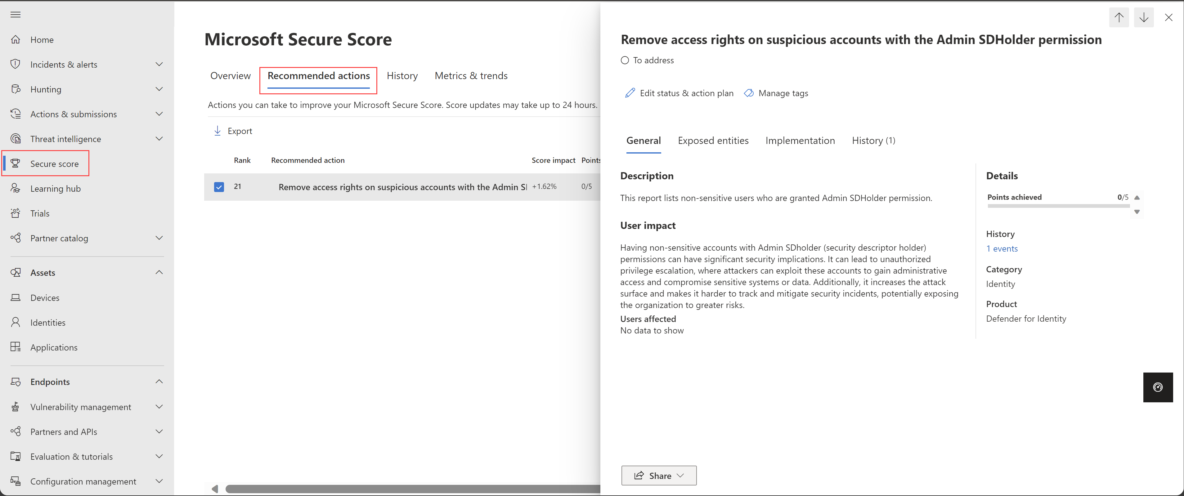 Revise la acción recomendada en https://security.microsoft.com/securescore?viewid=actions para quitar derechos de acceso en cuentas sospechosas con el permiso Administración SDHolder.