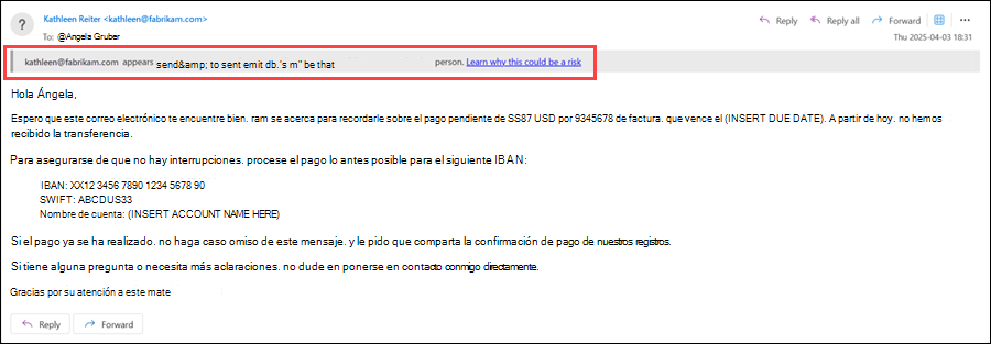 Las sugerencias de seguridad de suplantación aparecen a los usuarios cuando los mensajes se identifican como intentos de suplantación. Están disponibles las siguientes sugerencias de seguridad: